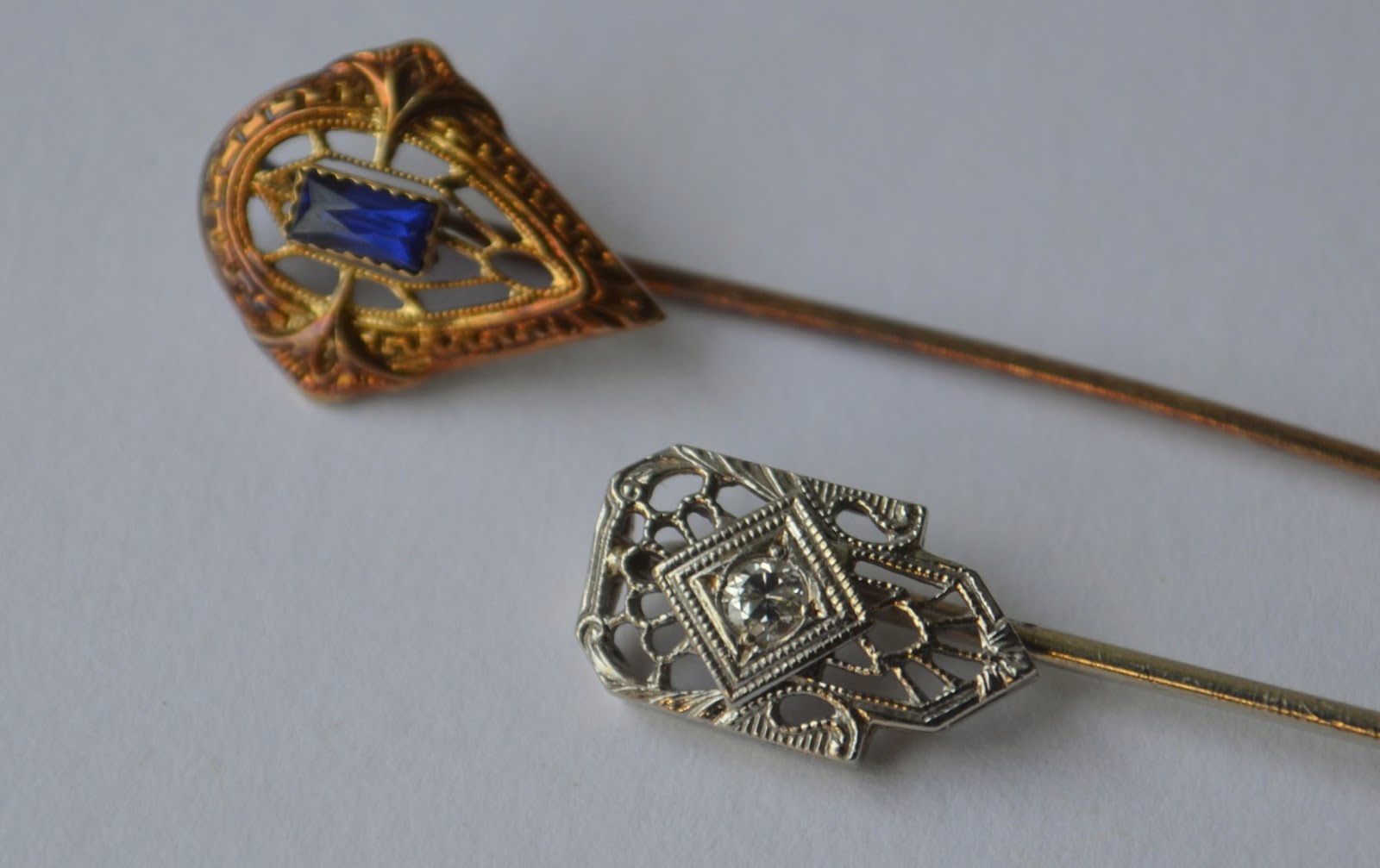 3. Assume that if the pin contains a colored stone, the stone is fake. Many, if not most, of the gems used in that antique jewelry from about 1900-1930 are not real. So what you pay should not include the stone. If you do get a pin with a colored stone that was advertised as real, you need to have it tested. And be aware that not all jewelers are good at this. I take mine to the lab because even some “jeweler’s tested” stick pins that I bought have contained fake colored stones. I didn’t complain though because I didn’t bet on the stone, and I know how hard it is to tell.