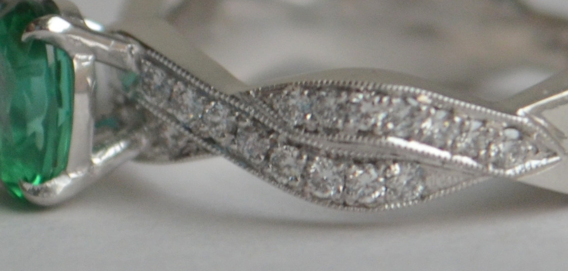 a) Bright Cut: This involves a straight line of metal on each side of the gem. This line has a standard thickness of 1mm. So if you want bright cut pave on your ring shank, you calculate the width of the melee plus 1mm on each side. So the smallest is 3mm for a shank. The bright cut can be millgrained, which is very common these days. Millgrain often costs a bit extra.