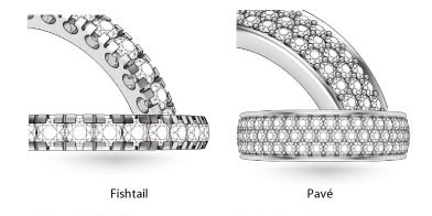 1. Ring with and depth. For millgrain pave you need .5mm of band on each side, so a 2mm stone will require a 3mm ring. For scoopdown or fishtail pave, you need the width of the gem only. The band thickness should be 1.5-1.8mm. The thinner the band, the more likely it is that it bends, and then stones fall out. Both my setters can do any of these styles, pave work is their strong suit.