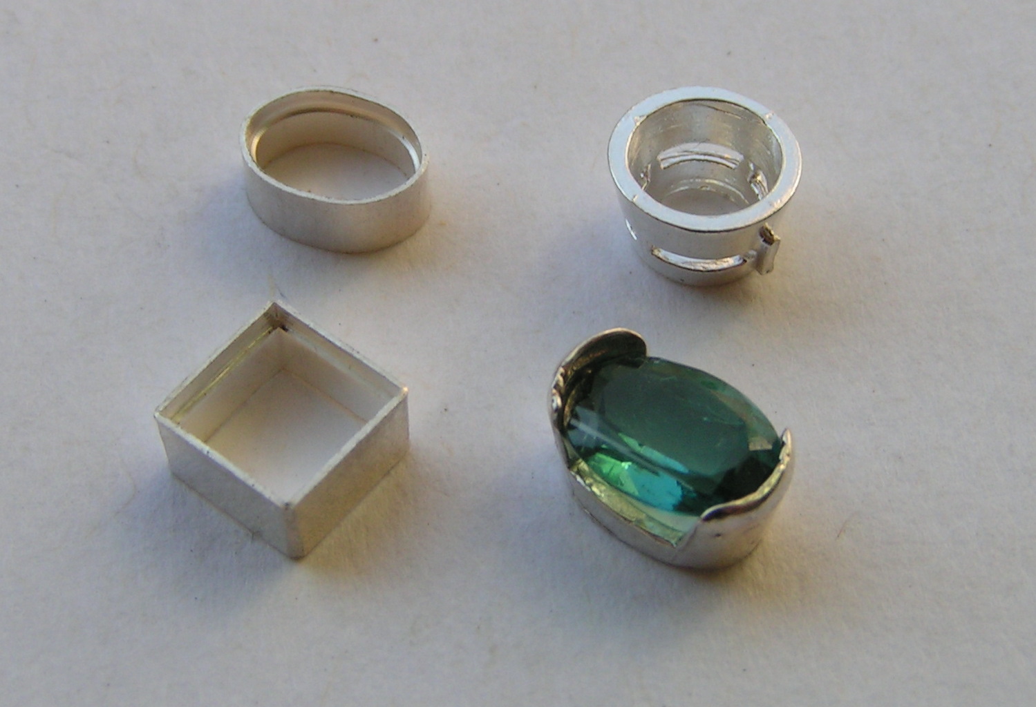 3. Not all stone shapes have bezels you can buy. Here’s a big mystery for you: there are no cushion shaped bezels available anywhere. Who knows why. It is the same with baguettes. For baguettes, you usually use prong settings or a setting (called tourmaline or baguette) that has two walls folding in on the stone on the outer ends.