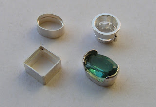 There are two ways to make a bezel (that I know of). The easy method is to use step bezel wire which has a second inner wall that will serve as the seat for the gem (look at the picture with the bezels, the way the straight bezels look gives you an idea of the shape of the wire). This wire gets folded gently around the stone, with grooves filed on the inside to allow corners to fold in, and the ends soldered together (or if you cut three pieces for, say, a triangle, then you solder the three seams). Making this kind of bezel takes about a half hour on average. And: I know how to do it!
