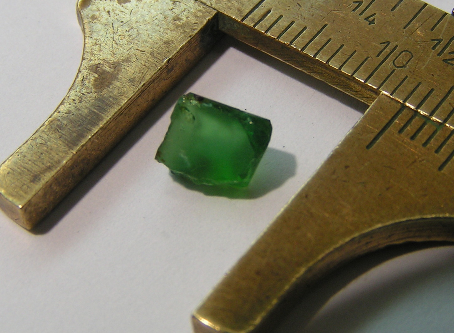 Now let’s get to the cutting. Below is a picture of the piece of rough that D. selected. This is a nice clean piece of a medium to dark forest green with an initial weight of 1.52 ct. According to D., its initial shape suggests to make it an emerald cut, and since we didn’t have any particular plan for the piece, we went with what was best for the stone (and what would preserve the most weight).