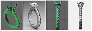 Let's first talk about how stones are set for commercial jewelry production. With most rings and other pieces nowadays being made in CAD, it is possible to cut holes into the model where the stones go, add the milgrain, as well as the beads that will be pushed over the gem. Even the "engraving" can be done in the CAD. Have a look at this CAD model.