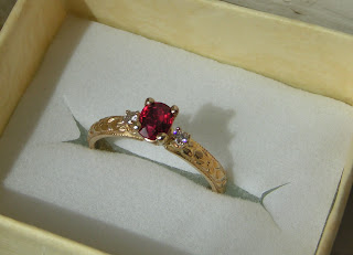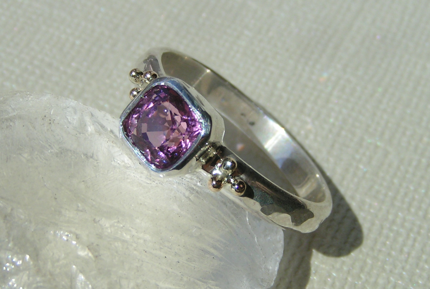 There’s one other very important factor to consider when you buy spinel. You must look for “open color”: a red stone, for instance, should be bright and sparkly, it should pop out at you. It should not look like garnet. In other words, you are avoiding what is sometimes called “grey mask”. This doesn’t make the stone look grey exactly, but as any graphic or interior designer will tell you, adding grey subdues a color. So a stone with grey mask has less presence, it looks a little lifeless. When I browsed the web for this blog entry, I came upon a site where you can see the grey mask in some of the purple and blue stones: http://awesomegems.com/spinel.html. I think you’ll see it clearly.