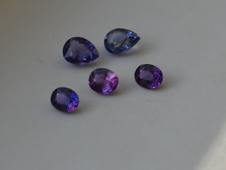 Color change sapphire usually changes from purple to pink, or from blueish purple to more reddish purple. The effect is less striking than in alexandrite because the colors are fairly close to one another on the color spectrum. I also own a little grey blue to reddish purple color changer from Sri Lanka. Those are less common. More often, you find color change phenomena in African stones, in particular, in the dark colored gems from Madagascar. Again, the deeper the color of the stone, the more striking is the color changing effect. Clean and brilliant stones with strong color change are not as common. Right now, sapphire is enjoying some steep price increases, but a 1 carat Madagascan color changer is nowhere near as expensive as a 1 carat Alex (think maybe $300 per carat wholesale).