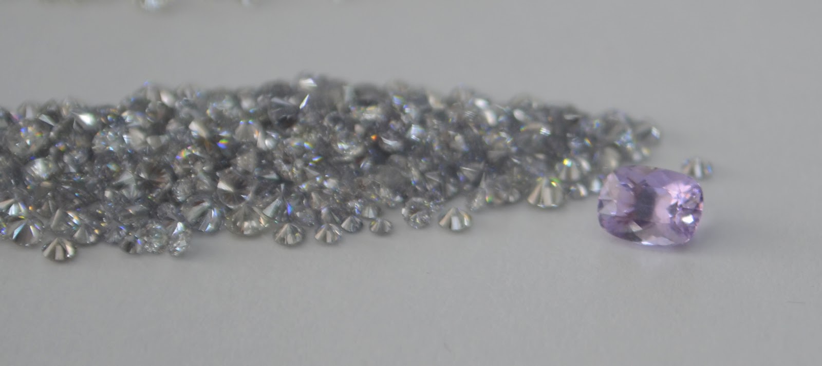 My favorite new colors were blue and grey, however. Those diamonds come from Easy Africa. The grey of these diamonds is not created by black piques (inclusions) but is actually in the body color of the gem. I am adding a photo of white diamonds for comparison. They greys are $2500 a carat, the blues are (sticker shock alert): $23000. Note that my markup is not my standard, it is a much lower add on because that's how this works. Diamonds are high priced and thus have lower markups than colored stones.