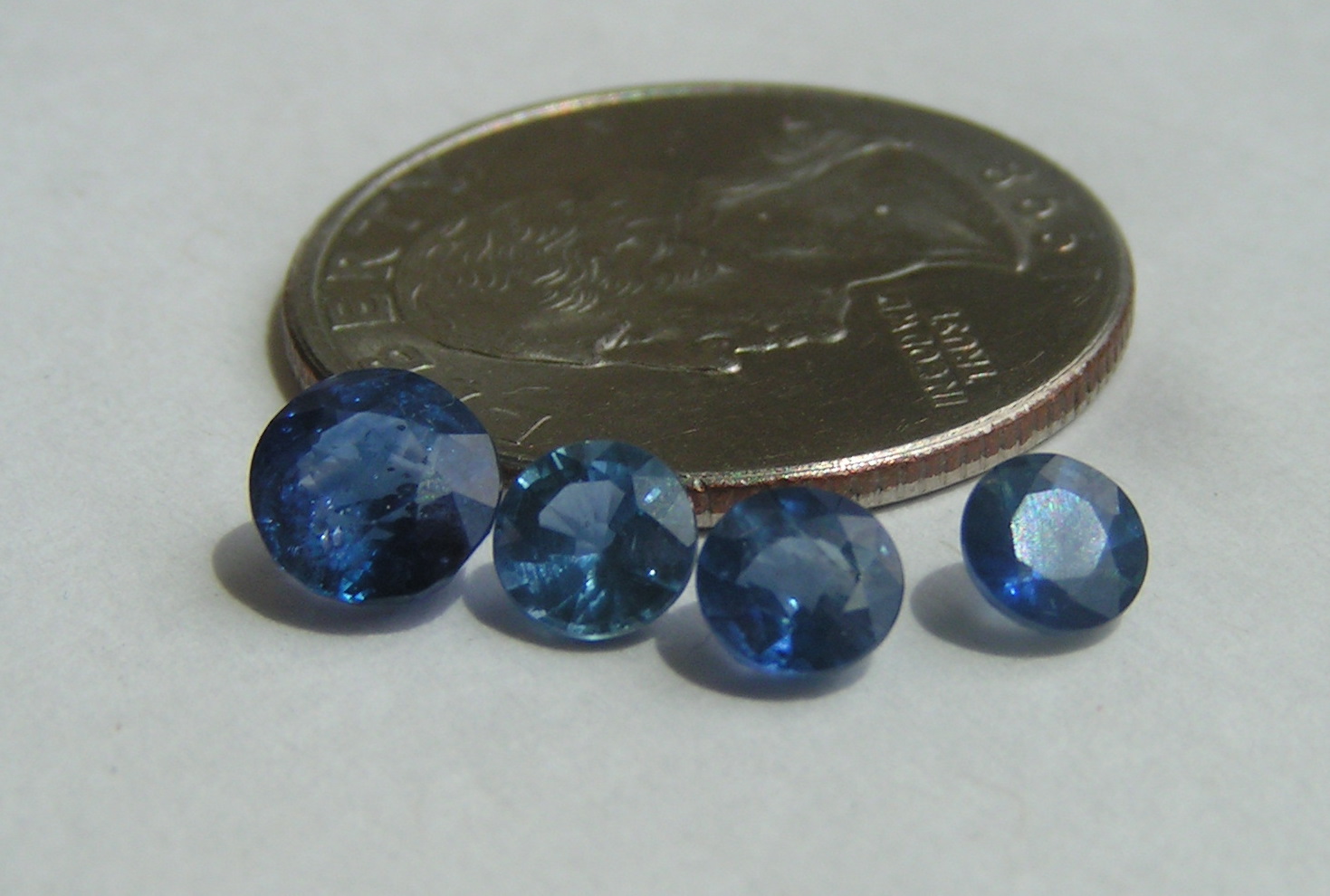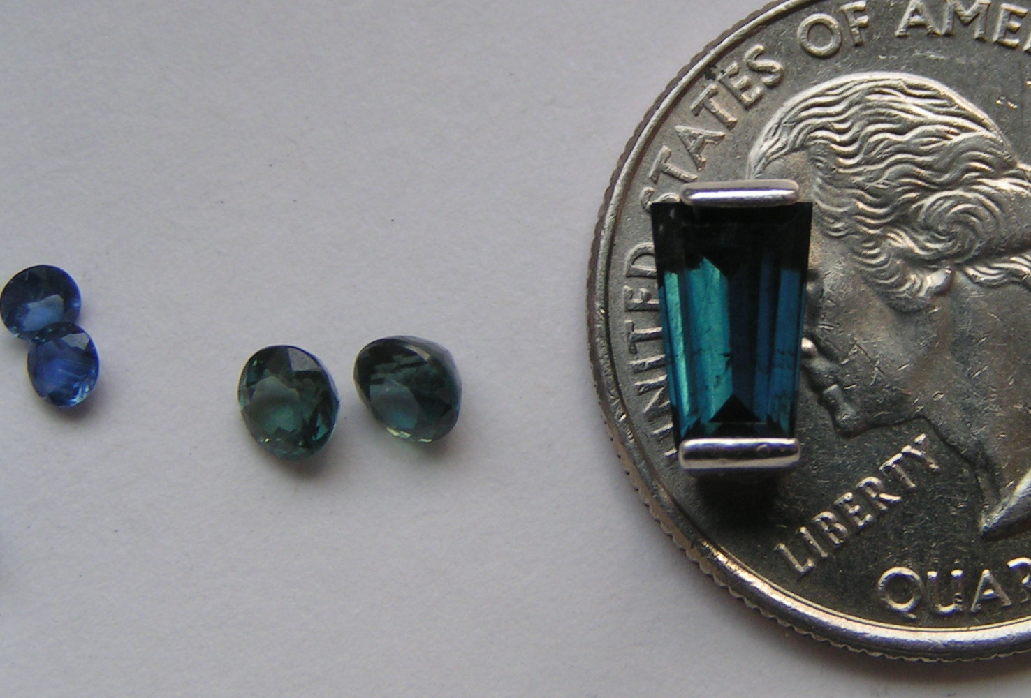In more or less the order of value, here are the other main sources for sapphire: Burma (Myanmar), Ceylon (Sri Lanka), Thailand, Australia, Tanzania. Burmese sapphires have a rich, medium dark royal blue color; they look a little like kyanite. Burmas are by far the most expensive sapphires on the market today, and are hard to get. Below is a picture of my unheated Burma sapphires here. If you want a pair like that, figure on $250 just for the stones. That gives you an idea. The Burmas I can get come from old stock – they are old mine, in dealer’s lingo. They were cut a long time ago.