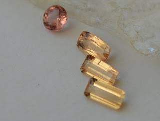 I own only a little bit of precious topaz, just the ones in the pictures above. The two matching baguettes are now set as earrings, the other two pieces are up for grabs if you are interested. I haven’t priced them but they don’t weigh more than half a carat I think. I got the pink round in Germany from a cutter who was “cleaning out.” When I saw the piece I was already aware that the trading price was higher than what his tag indicated, so I snatched it. The rectangular cushion and the tourmaline cuts are from my friend D., who has a very tiny parcel. There’s no other cushion cut, though.