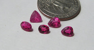 In some cases, certain hues of color are simply no longer found in the mines. Take pink tourmaline, for instance. In the picture below, the two pear shapes and the trilliant cut are old mine. When you compare them to the oval in the front, you can see the difference. There are more rose tones in the old miners, the color is softer and velvety. In the picture that I took of just the pear shapes, this is more obvious. And if I just look at them sitting on my desk, the color of the old miners just pops out more.