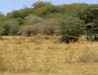 The lions were hanging out about 300 feet away. It was a couple, the female had just hunted and killed an animal - we couldn't see what it was - and they were munching away, then resting lazily in the sun. A coyote was nearby, waiting for them to be done so he could finish up the rest. The lions seemed content. I took a lot of photos from the distance but my lens was not strong enough so they are hard to see. My final treat toward the end of the ride were some elephants nibbling the leaves off a tree directly by the roadside. Elephants have no natural enemies, I am told, so they are extremely relaxed animals. There was a really big older guy about 2 meters away from my car, curiously eyeing me with one eye while eating. Even our driver had never seen anything like it, and he had been in the park a few times already. I got a great video of him. I left the window rolled up for the most part, just to be sure he wasn't going to stick his long nose into the window to see what was up inside. Or decide to lean against the car, which would have definitely tumbled us over. He was at least twice as heavy as we were.