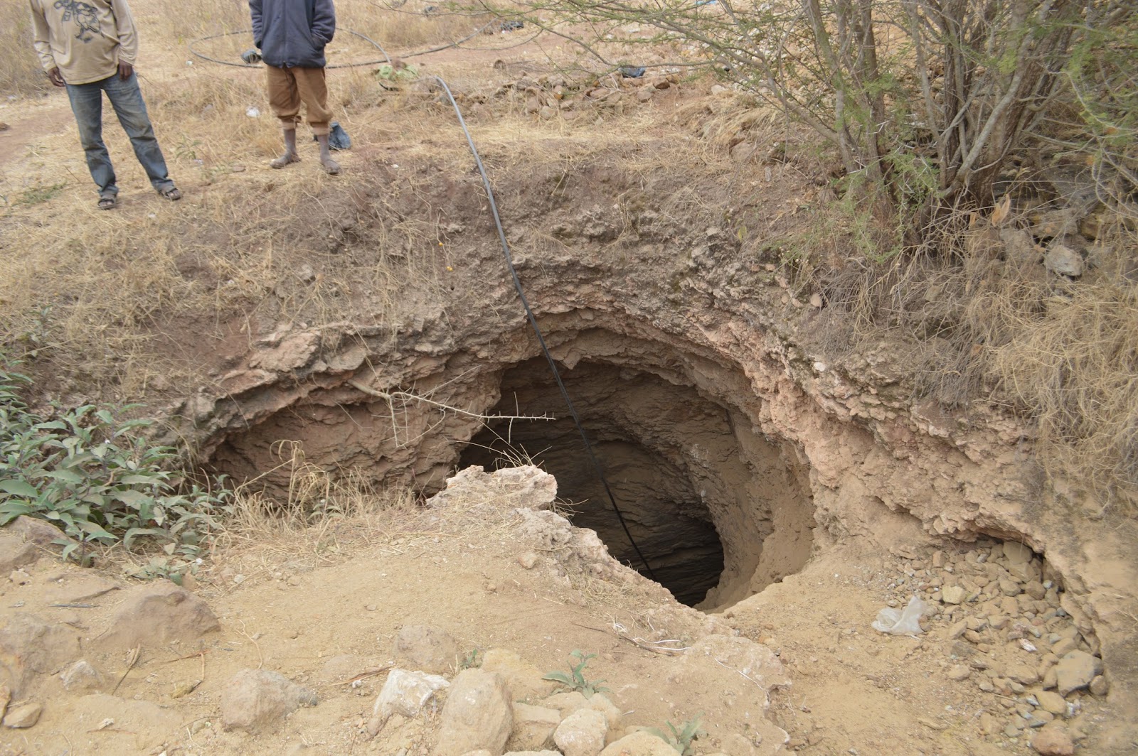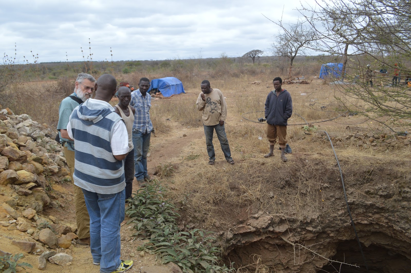 Finally, after yet another 30 minutes, we were told we had arrived. About 20 yards away, there were some blue tarp tents, very close to a white pile of rocks mostly consisting of calcite. We got out of the car and walked up to the small group of men sitting around a camp fire. It was lunchtime and they were eating ugali with some cooked beans, eaten by hand according to custom. We got friendly stares, and Moustache chatted with them in the Masai language. They got up to show us the hole and talked about the green tourmaline. The town had been sponsored by a local dealer who had brought a generator with a hose to bring air into the mine. It was about 70 meters long, they said (that's 210 feet), so air was needed at the far end of the shaft. Their lighting consisted of flashlights fastened around their heads, not the mining lamps we have. I was sad I hadn't brought my headband with the reading lamp, they could have obviously used it. Jochen in turn was sad that he couldn't go into the mine. He hadn't expected to find anything of interest, and so he wasn't wearing jeans and he had left his hammer at the hotel. Otherwise he would have climbed down. I, in turn, was totally satisfied just looking down into the hole and taking some video.