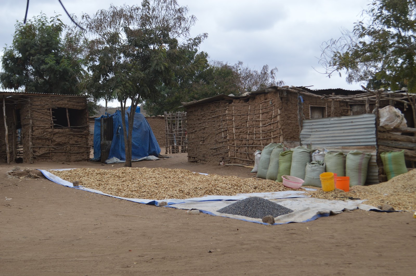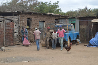 Another half hour later we reached the little village of Mwajanga. At first, I was told, the women were hiding under the bed because a van with white people came. Many had seen few to no white people before, and with near certainty, I will say that they had not seen a white woman. Very few women make it that far into the bush, but I had a good guide so I was really not very concerned. The culture is friendly, and we traveled during the daytime (it's obvious when you think about it, but it is VERY dark to drive in a dirt road at night without street lights). Anyway, after Moustache got out of the car and started chatting with the locals about the mines, people started re-appearing. An elder came by and greeted us. Doreen looked at the dry beans that were being harvested and asked about prices. A few people came by and showed us goods - bad stuff at first. A discussion ensued about the blue capped tourmaline crystals Jochen had gotten there two years ago, a fresh production that only he and one other dealer bought up. Those were no longer being found, they said.