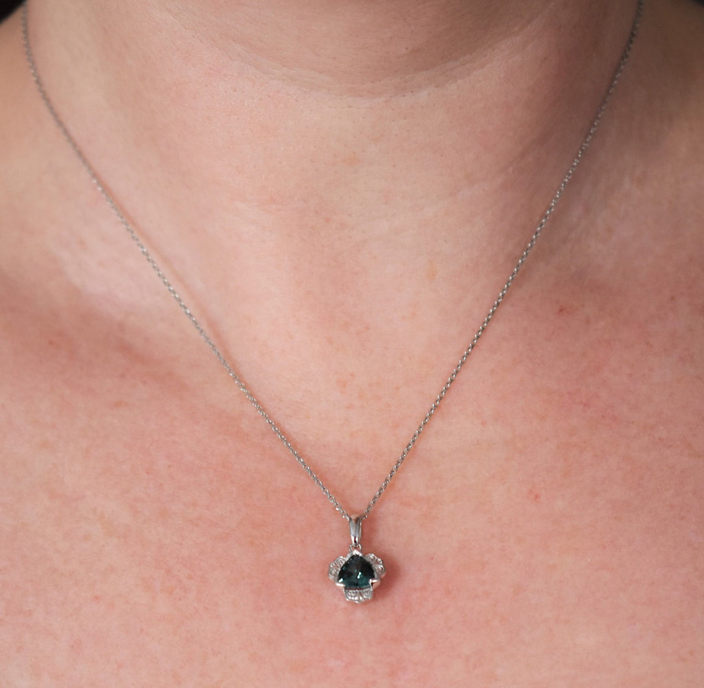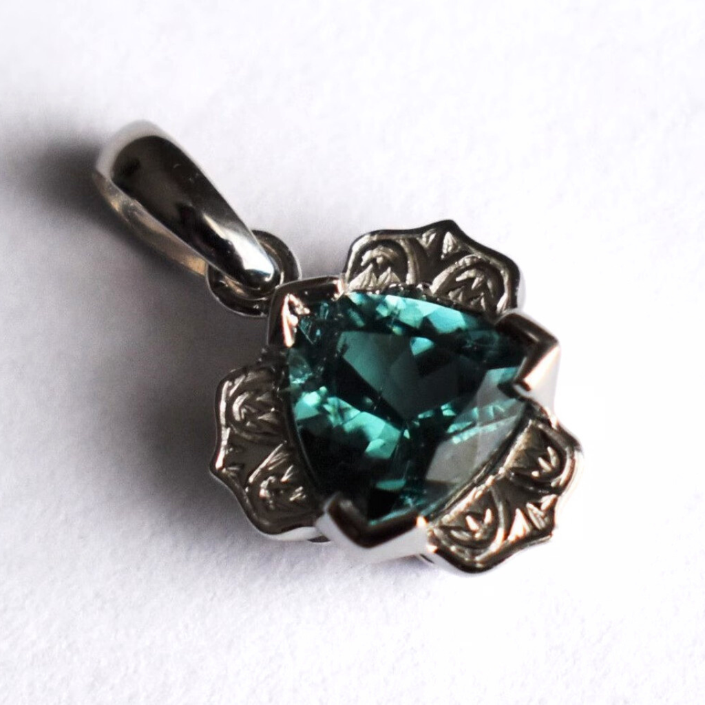 This pendant is called Gatsby because it is reminiscent of the 1930s and inspired by an antique flower motif. The center holds a 5mm trillion and the outer halo is hand engraved before casting. It can be finished with hand applied millgrain if desired.