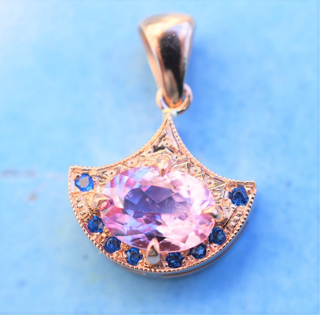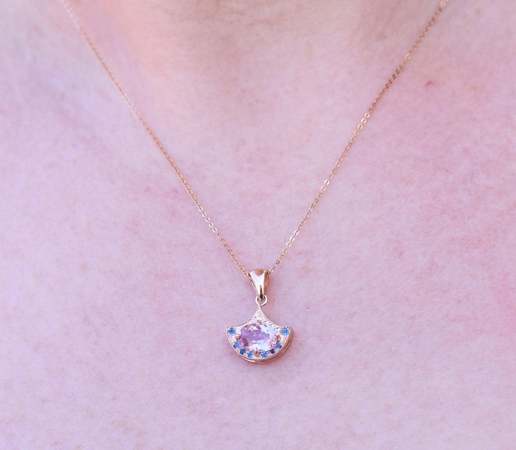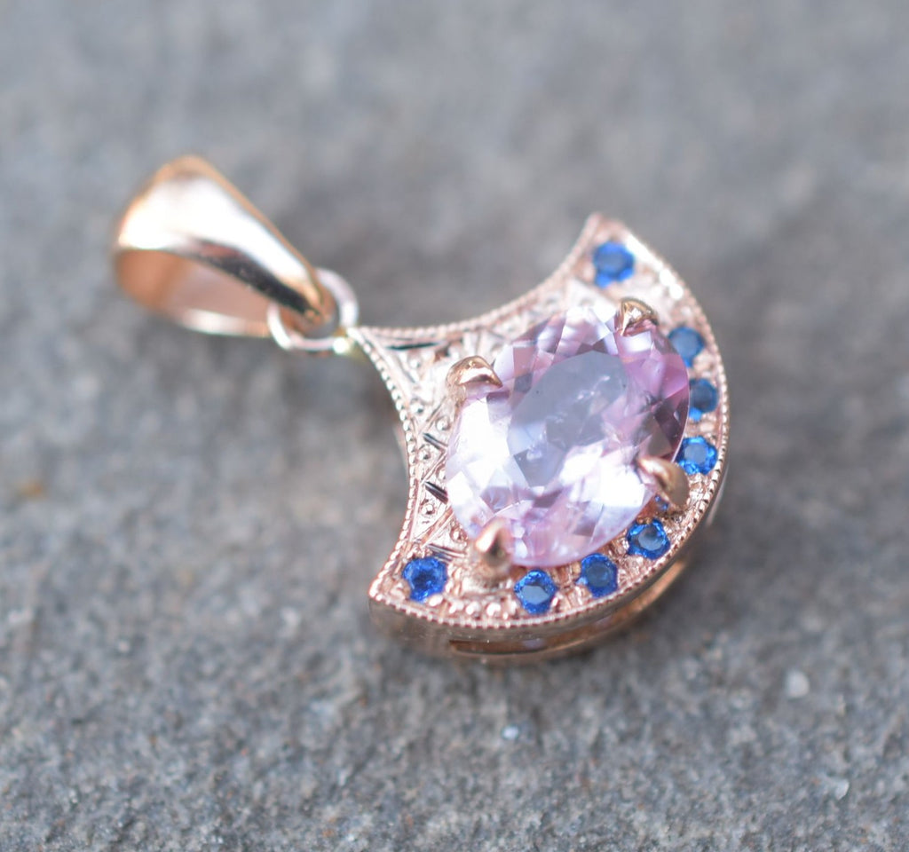Our Fan Pendant is art deco inspired and is accentuated by hand engraving and millgrain. The center gem is a 7x5mm oval and we have a wide range of sidestones to choose from.