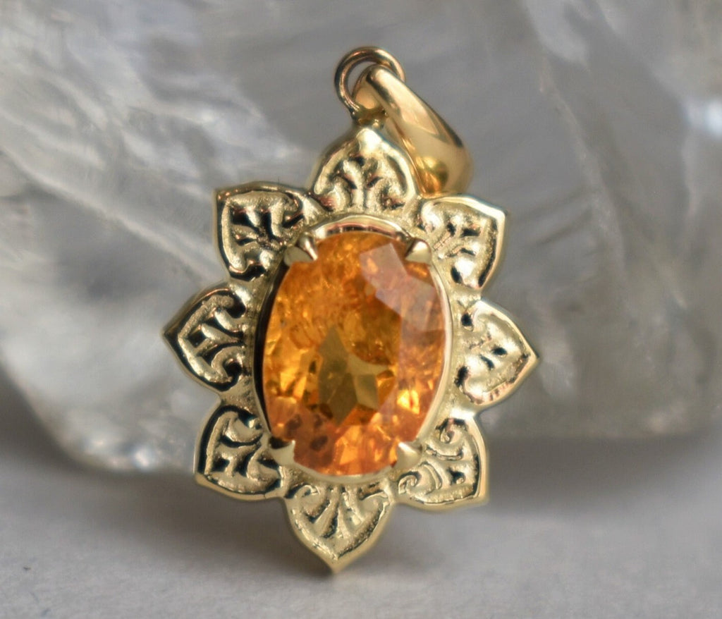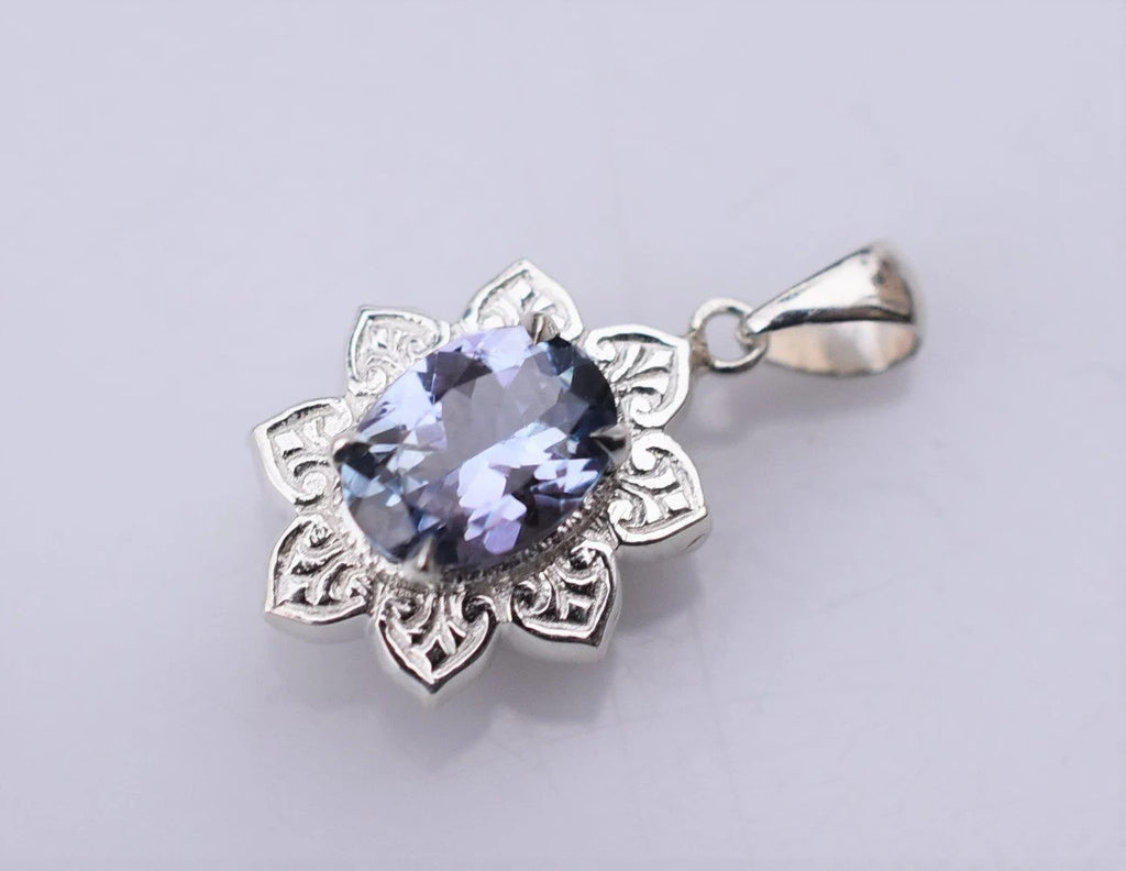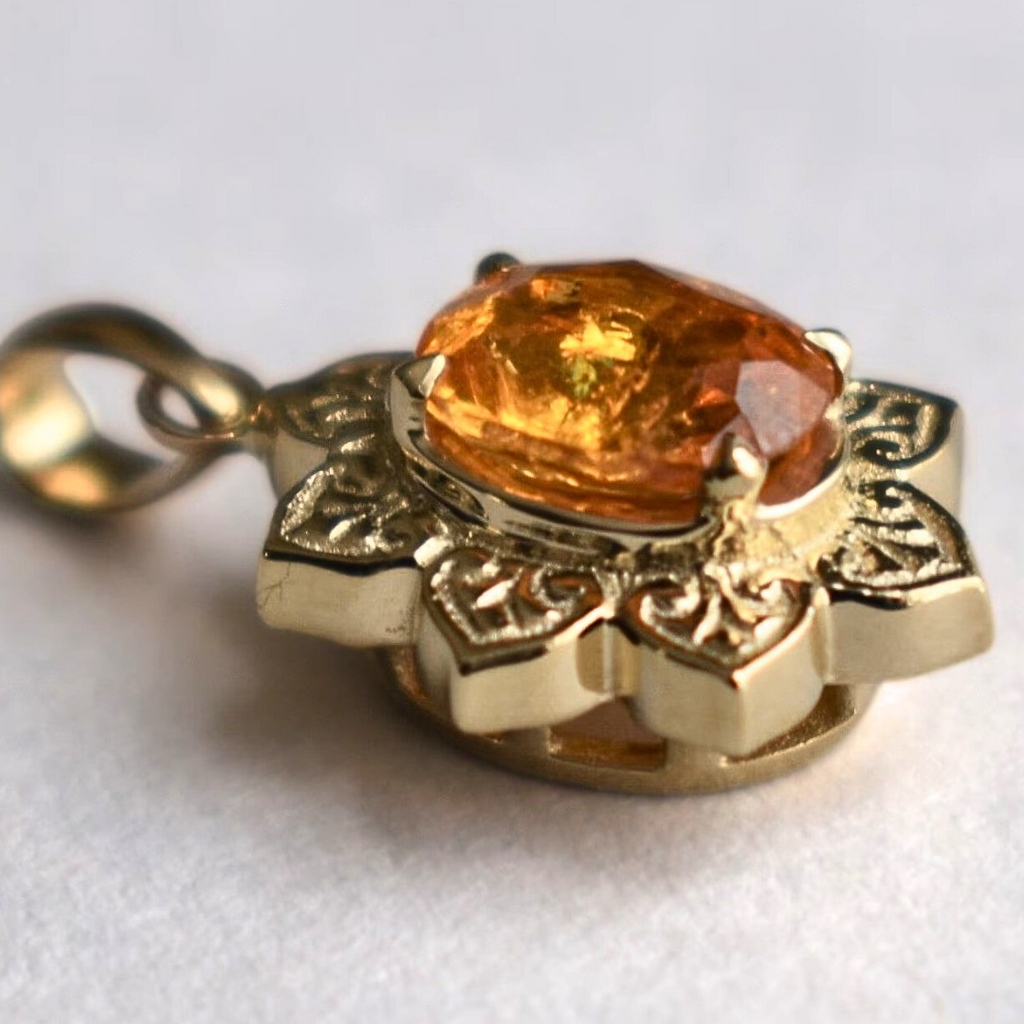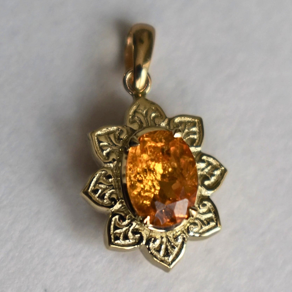 Named after a summer flower, our beautiful sunflower pendant holds a 7x5mm oval center stone. Designed exclusively for our shop, the petals come to a point and are accented with hand applied millgrain while the center gem is set with delicate claw prongs.