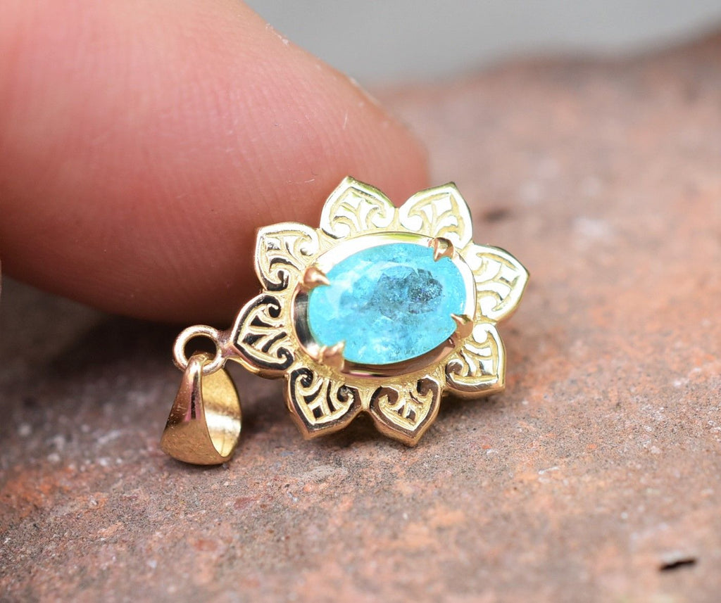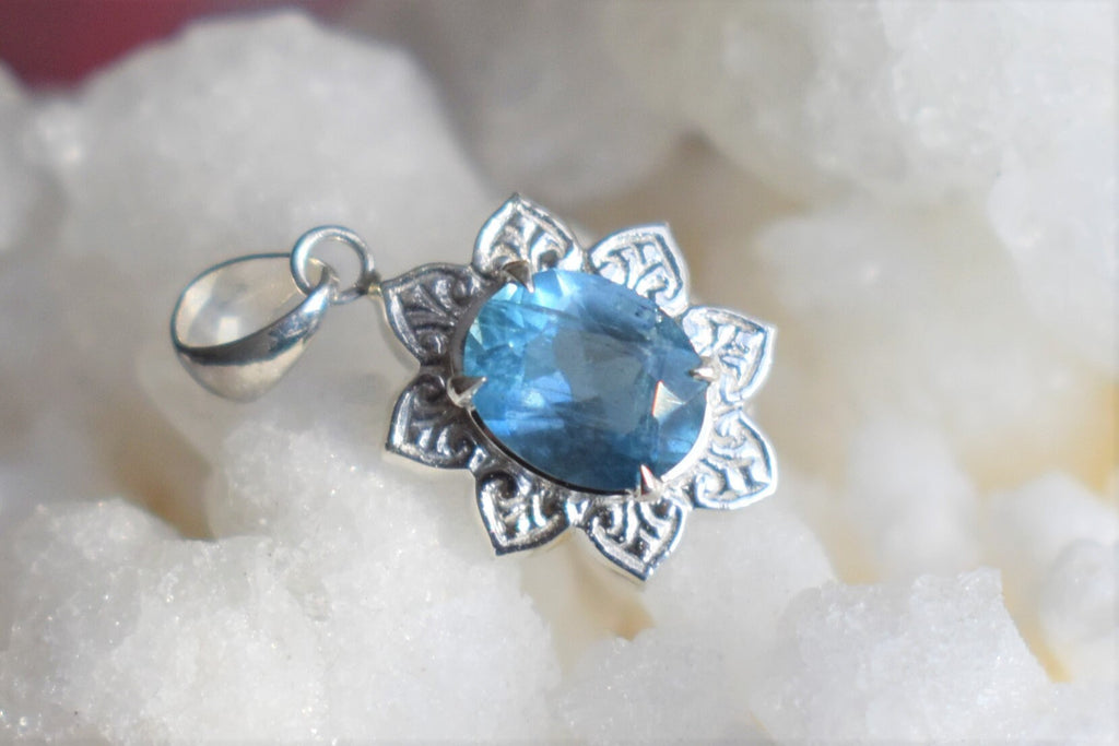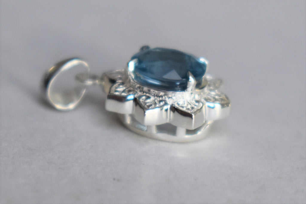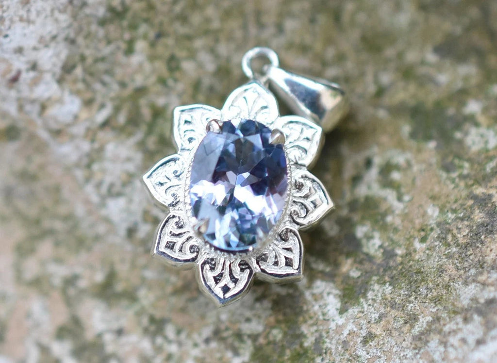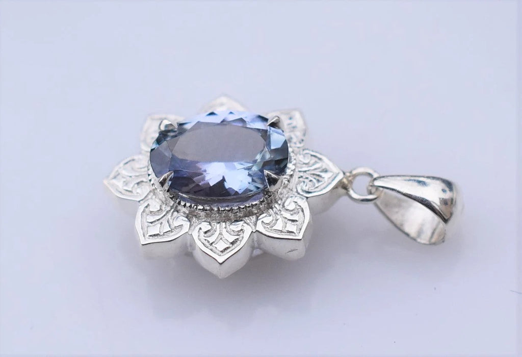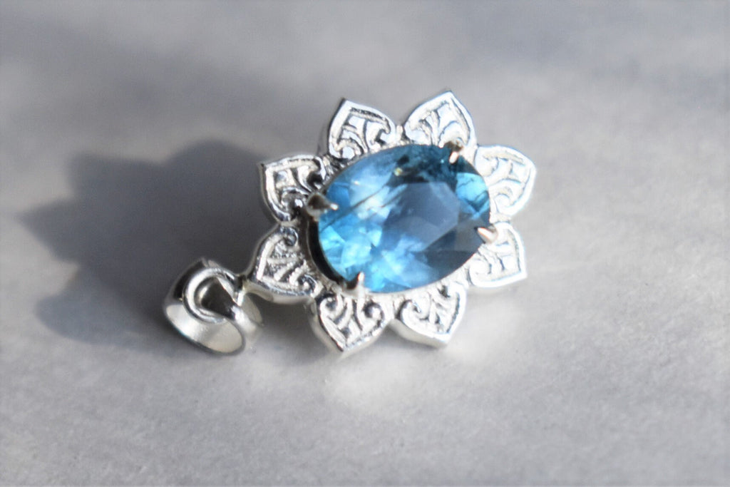 Named after a summer flower, our beautiful sunflower pendant holds a 7x5mm oval center stone. Designed exclusively for our shop, the petals come to a point and are accented with hand applied millgrain while the center gem is set with delicate claw prongs.