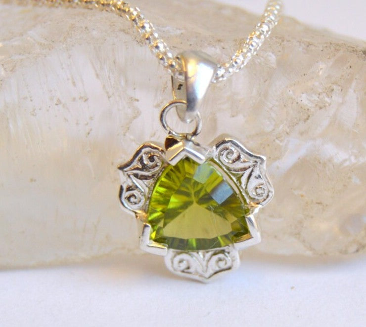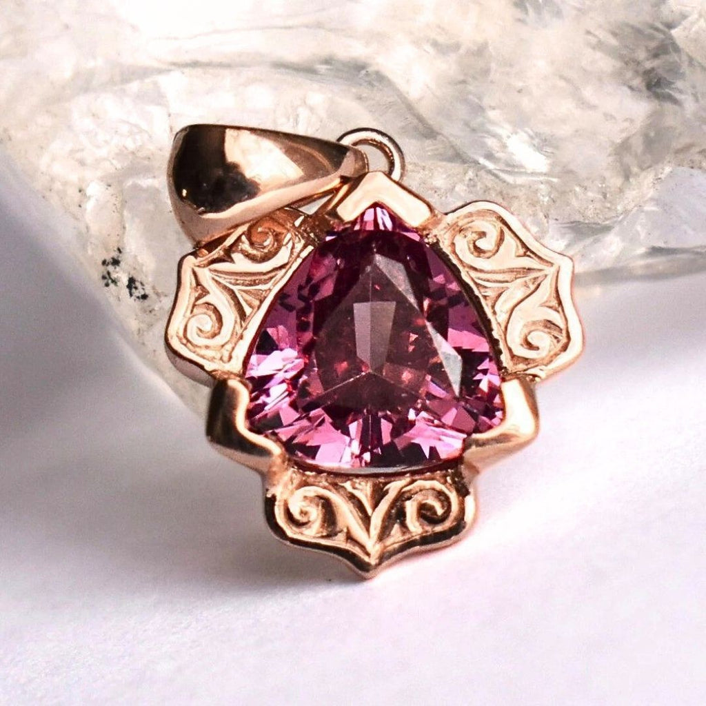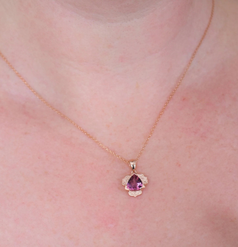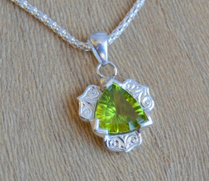 This pendant is called Gatsby because it is reminiscent of the 1930s and inspired by an antique flower motif. The center holds an 8mm trillion and the outer halo is hand engraved before casting. It can be finished with hand applied millgrain if desired.